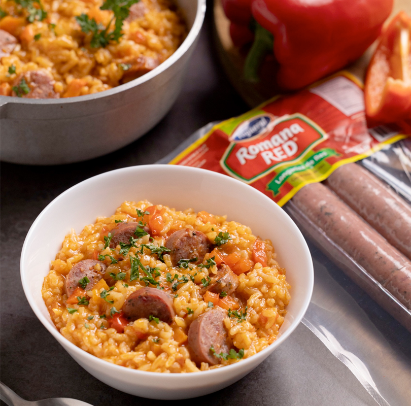 ¡Disfruta del delicioso Arroz caldoso con Longaniza Romana Red® picante!